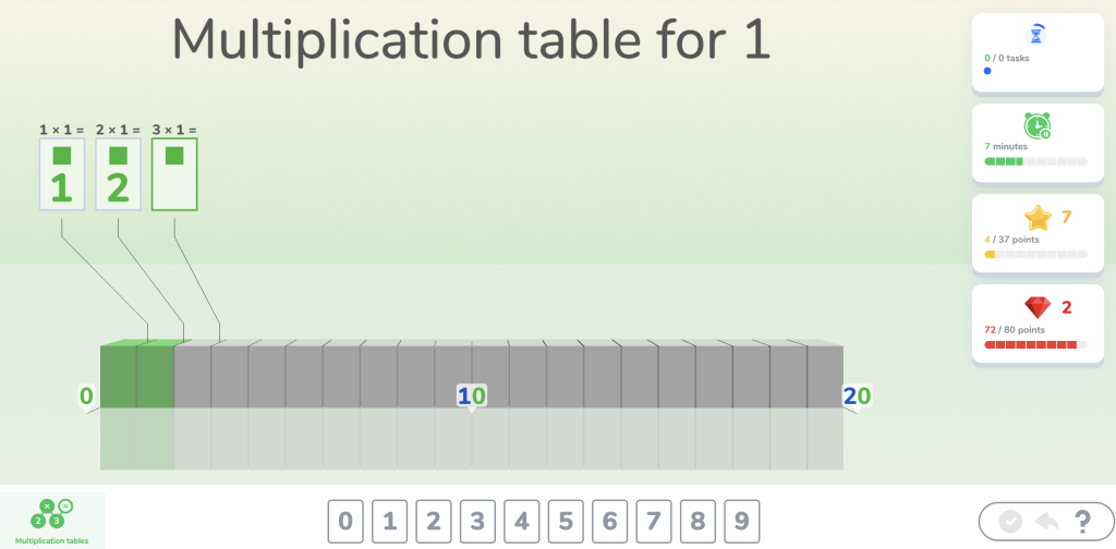 We didn’t really get on to the point of doing multiplication and division activities, but again there are a range of games with gradually increasing difficulty. In the screenshot below you can see one of the first activities for the one times table.