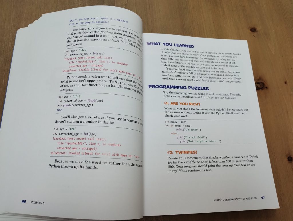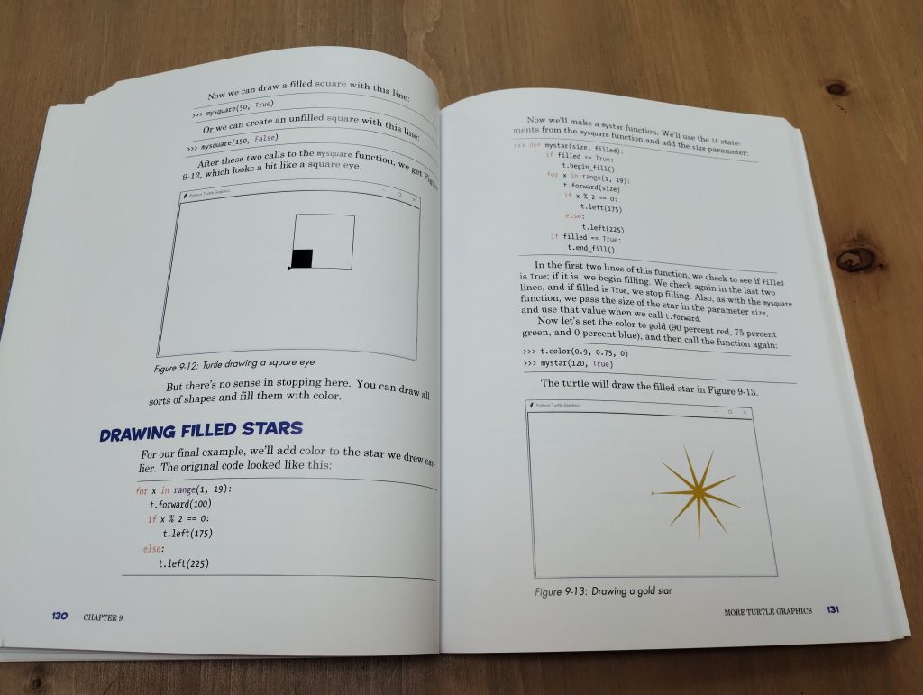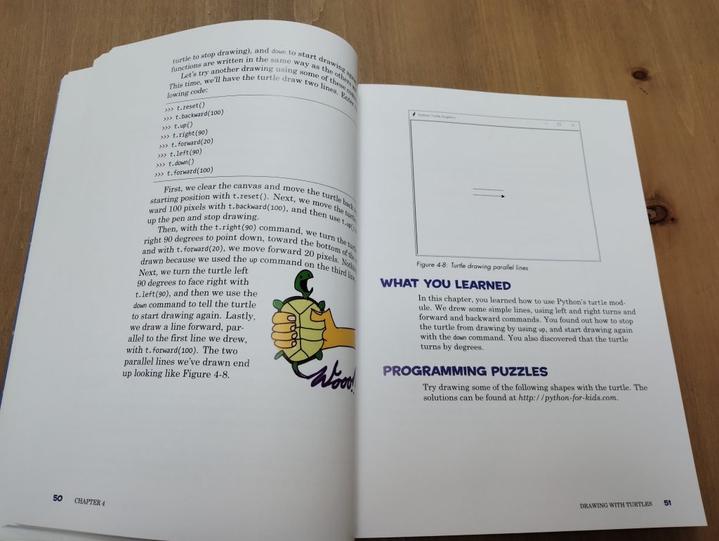 The book then runs through some simple Python language, such as variables, strings, lists and dictionaries. There is some graphics based programming using the turtle. Then some chapters on if/else, loops, classes and objects. For each step, the code that you need to write in the shell is clearly written in the book. My child only got stuck a few times in this first half of the book, and the problem was generally that they had missed a dot or put a space in the wrong place. As the programs were quite short, it was easy to find the problem and resolve. They had a lot of fun with the book, and were fairly independent.