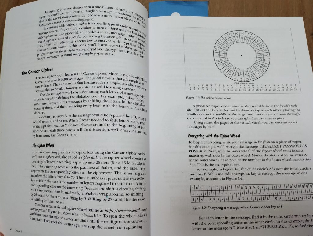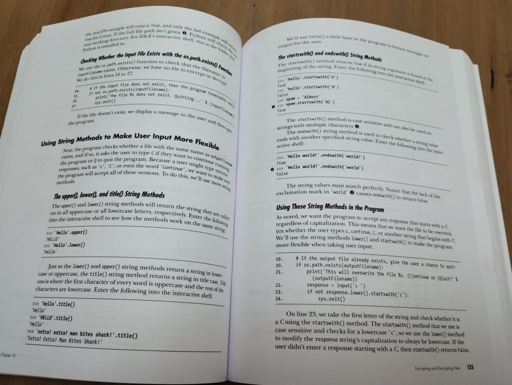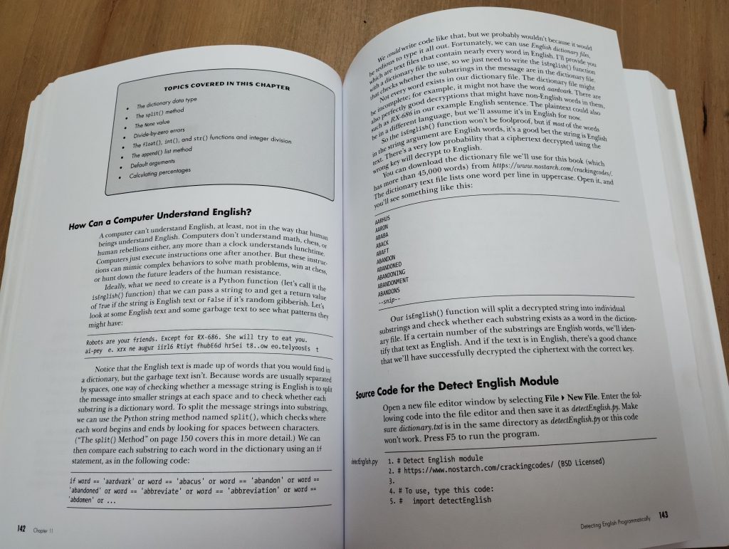 My child was really enthusiastic about this book and enjoyed the first few chapters enormously. However, they then got quite stuck again, just under half way through the book in Chapter 11, where the book moves on to brute-force programs. The problem was not really the Python itself, but around making sure that the required files (e.g. dictionary) were saved appropriately in the same location. This was a problem we had encountered in the previous book too. We probably will carry on with this book in the future, but decided to revert to an online offering that they could use more independently for now.