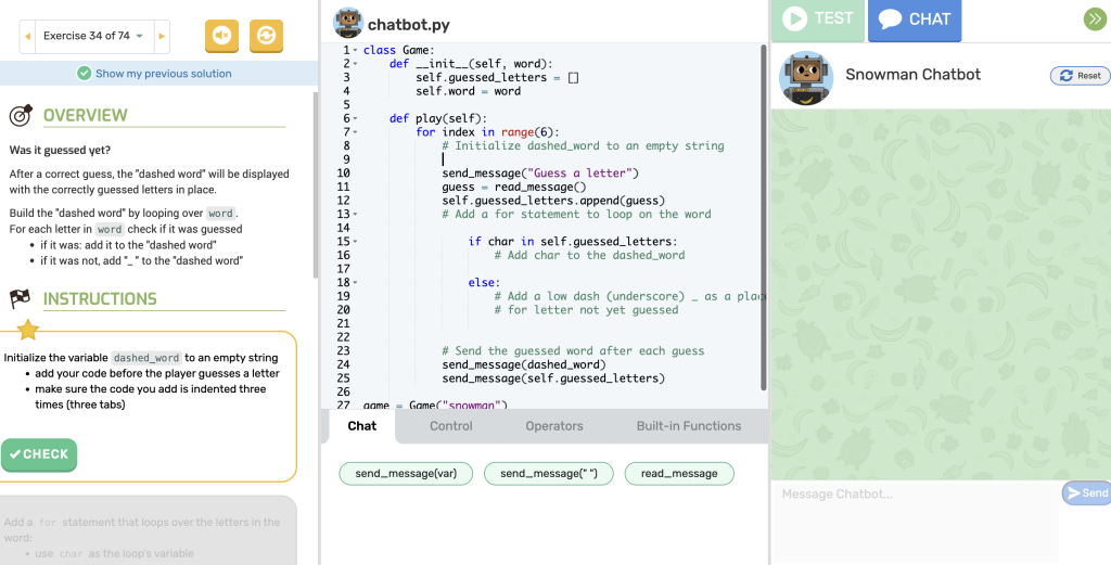 My child was able to make steady progress with Coding Chatbots on their own, and it felt like a nice independent option to keep their Python skills going whilst we consider what to try next. I really like the design for the instructions in Coding Chatbots. The instructions for the exercise are given step-by-step down the left hand side of the screen. After completing each instruction, you can check your work, and the next instruction will be unlocked if you are correct. Otherwise you will be directed to have another go. This is a great frustration limiter for younger children, because it makes it much easier to identify any problems quickly.
