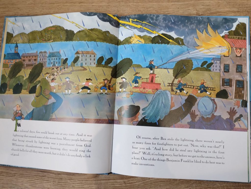 A biography of Franklin for younger children, with lots of sweet illustrations. The first two thirds of the book give an overview of Franklin’s life and some of his inventions. Roughly the last third is devoted to his work on electricity, and the development of the lightning rod. I was slightly disappointed in this book as I was hoping for more scientific detail. This book does not provide that, but it is an enjoyable read for younger children.